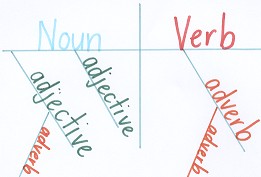 I teach adverbs in the same way as above. We copy a sentence - de-clutter it, and then add on our own nouns, verbs and then think of ways we can describe the nouns (adjectives) and the verbs(adverbs). We write these words under the verb on a slanted line. Adverbs also modify adjectives so we will add another slanted line to the adjective if we have added an adverb.