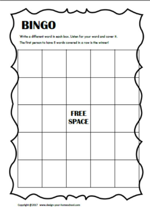 This game is played with a simple BINGO board. The child writes down 24 words on the grid. These could be words they are learning at the time. They can place the words wherever they like on their BINGO card.