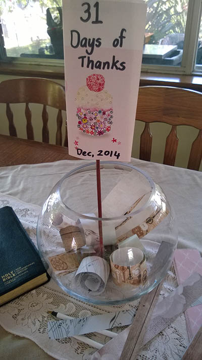 Then we write it out on a little slip of paper - and add it to our large glass 31 Days of Thanks Jar.